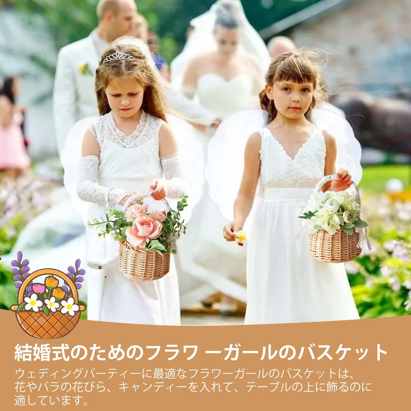 フラワーガール バスケット 編み込み バスケット 取っ手付き籐 ウェディング バスケット 花かご 小さい 2個セット 柳 バスケット ハンドルとホワイトリボン付き 軽量 小物入れ 結婚式 披露宴 花嫁 パーティー アクセサリー イースター 飾り ギフト キャンプ 家の装飾 写真撮影用小道具