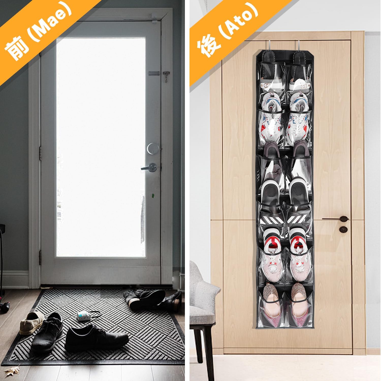 ウォールポケット 壁掛け収納 ア掛け収納式ポケット 6段の大容量 透明窓付き 吊り下げ収納ポケット 不織布 頑丈 耐用 小物収納 タオル 化粧品 おもちゃ リモコン 雑誌 書類/漫画などの収納 フック2個付き・展示用 12ポケット (黒)