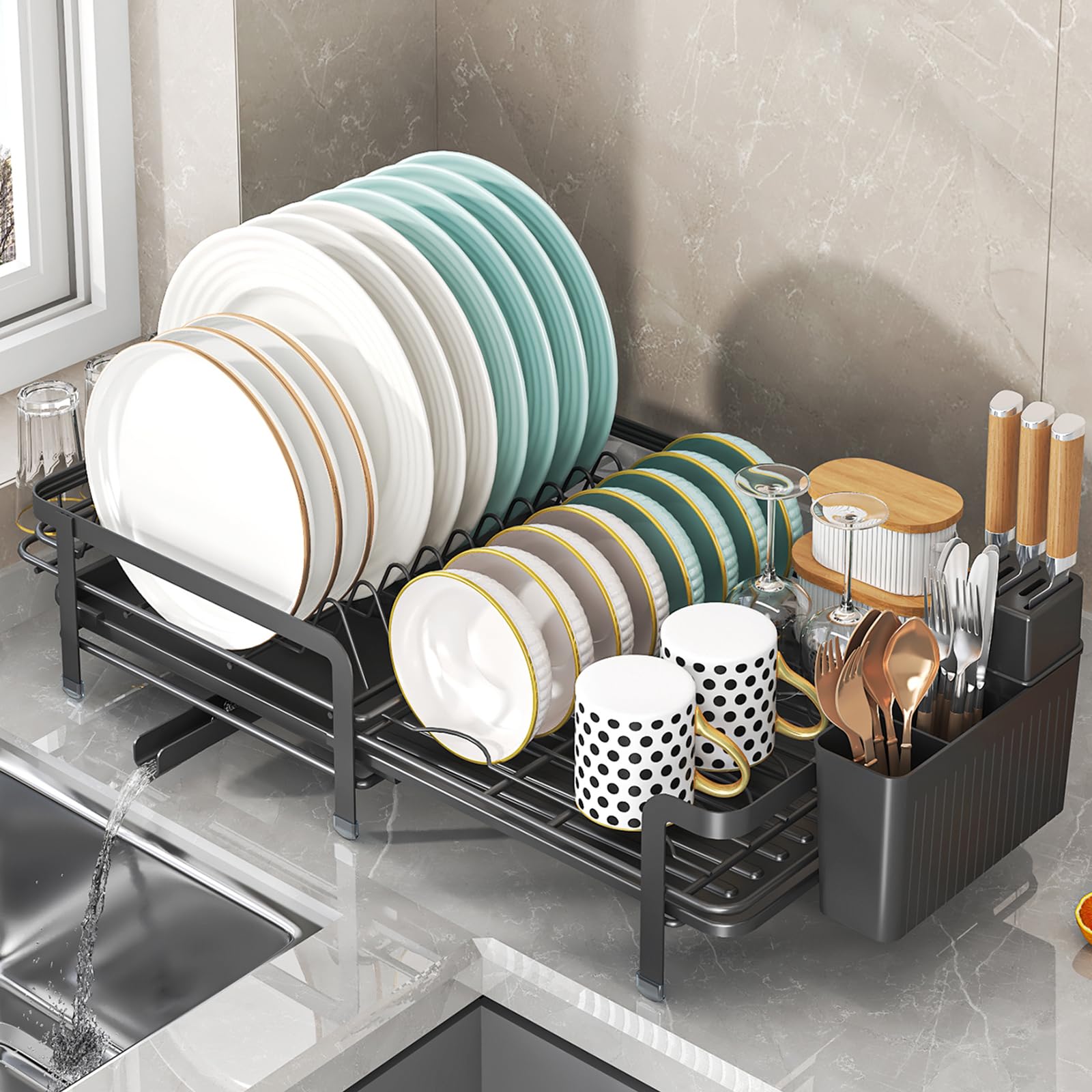 COVAODQ 水切りラック 水切りかご ステンレス製 キッチン収納ラック 水が流れる 箸立て コップかけ食器かご (ブラック)