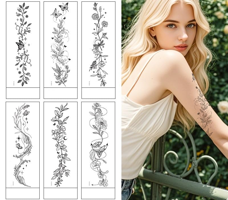 ブラック&ホワイト タトゥーシール 防水 シール タトゥー ステッカー 動物 蝶 花 一時的 ボディシール おしゃれ メンズ レディース 簡単貼付け 長持ち 洗える 肌に優しい フェイクタトゥー パーティー フェス コスプレ プレゼント (黒い花60*230 MM(10枚))