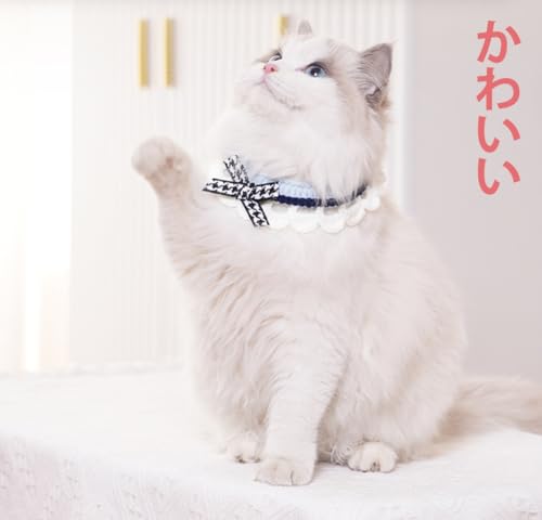 Wag&Winkペット 首輪 犬 猫 可愛い 調節可能 バンダナ よだれかけ 日系INS風 千鳥格 蝶結び レース 綿 S/M/Lサイズ 日常 おしゃれ プレゼント 軽量 安全 多機能 (レース青, S)