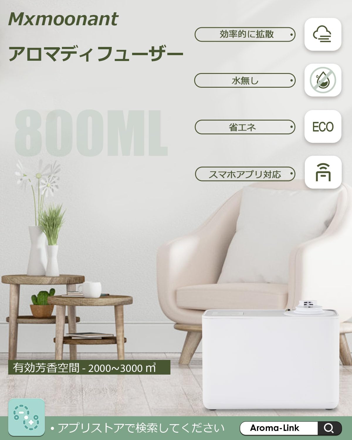 Mxmoonant アロマディフューザー 水なし 業務用 800ml 空調換気設備接続可能 2000-3000㎥適用 アプリ対応 リードディフューザー ホテル サロン オフェス 脱臭 香り