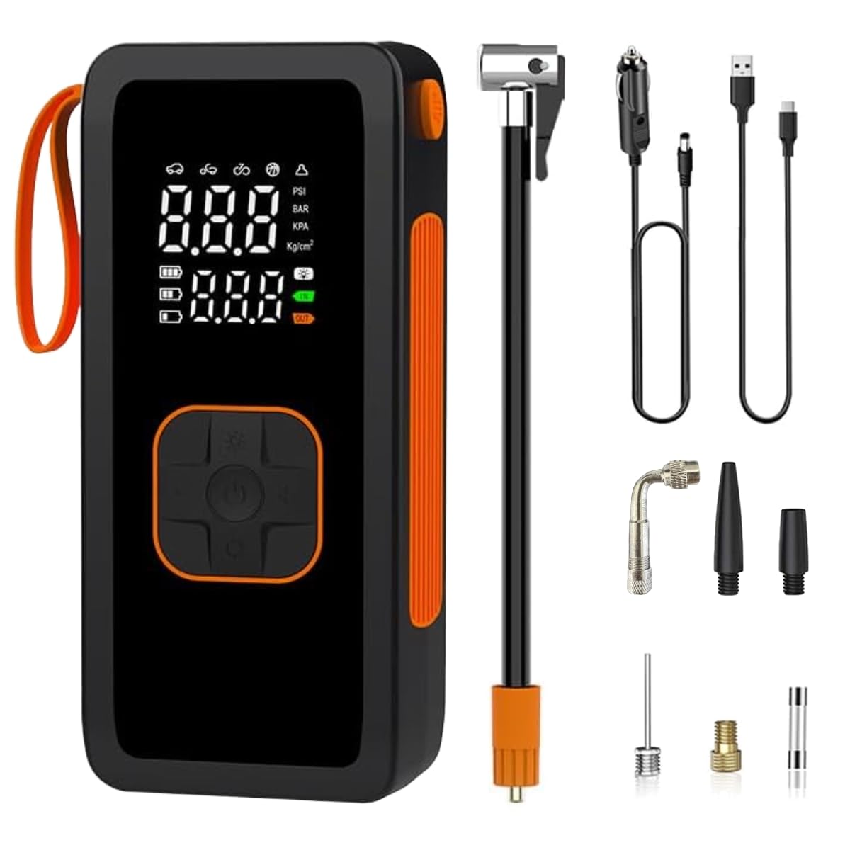 タイヤインフレーター ポータブルエアコンプレッサー、自動車タイヤ、オートバイ、自転車用エアコンプレッサー、6000mAhエアポンプタイヤインフレーター デジタル圧力計付き、コードレスタイヤ空気圧計 LEDライト付き