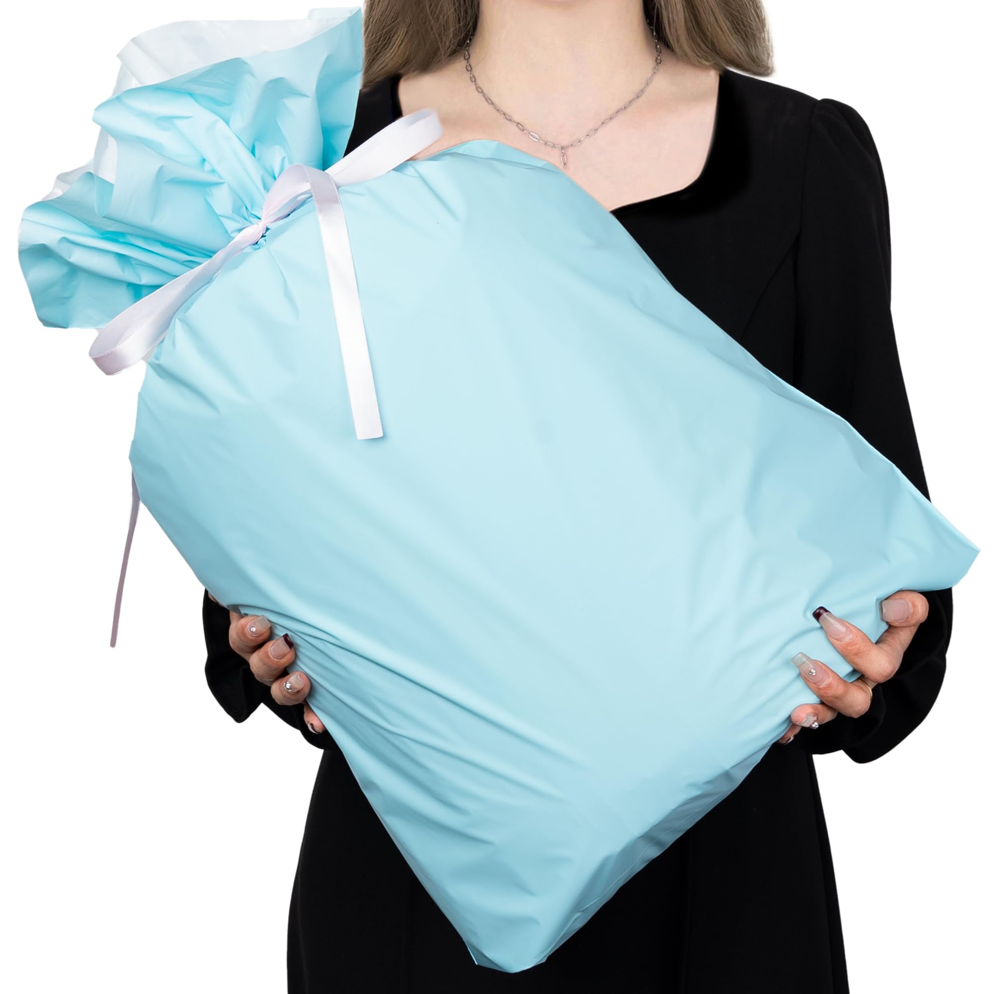 ラッピング 袋 大きい プレゼント 大 【XL特大サイズ・バイカラー・様々なシーンで活躍】 巾着袋 ギフトラッピング 贈り物 プレゼント用 包装袋 バレンタイン 誕生日 ギフト ギフトバッグ ギフト袋 ラッピング用品 可愛い グリーティングカード付き (巾着袋XL(ライトブルー))