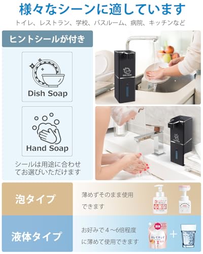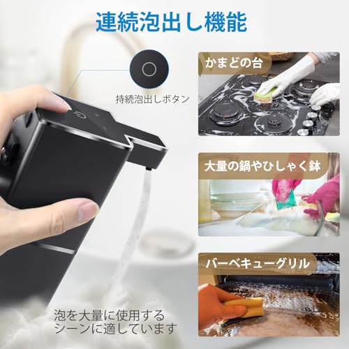 Varluckiner ソープディスペンサー ハンドソープ オートディスペンサー 自動 泡 380ml 吐出量4段階調节 壁掛け 充電式 キッチン 洗面所などに適用 日本語説明書付き (泡タイプ, ブラック)