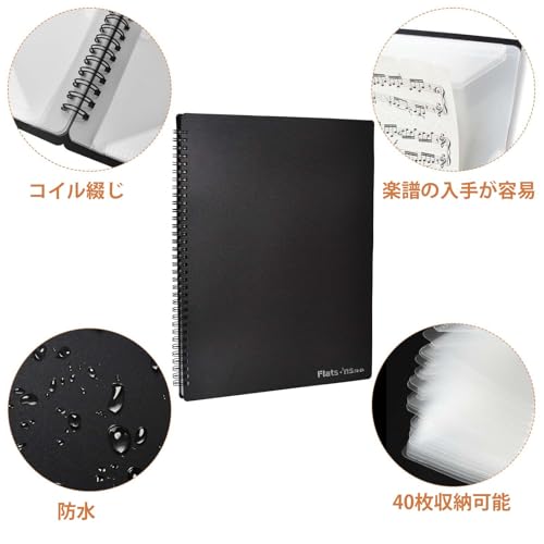 楽譜フォルダー 4面 譜面入れファイル A4 書き込める 黒 スパイラルバインダー 40ページ 楽譜 収納 整理 ピアノ ギター 発表会、コンサート、クラブ活動、管楽器、練習、レッスン、授業、ライブ、歌、演奏