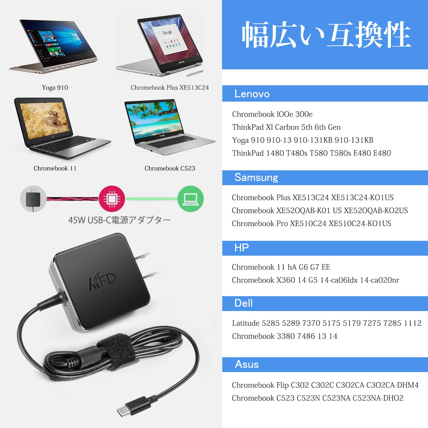 KFD PD 45W USB Type-C 急速充電器 ノートPC用ACアダプタ 【45w急速充電/2mケーブル一体型/折畳式プラグ/PSE】20V 2.25A Type-C ノートパソコン電源アダプター汎用MacBook Air,Toshiba Dynabook,NEC VersaPro,Lenovo ThinkPad/Chromebook,Son y VIAO,Panasonic,富士通,東芝,Dell,HP,Galaxy S22などCタイプ ノートPC/ラップトップ/スマートフォン/ゲーム機 交換用電源アダプター